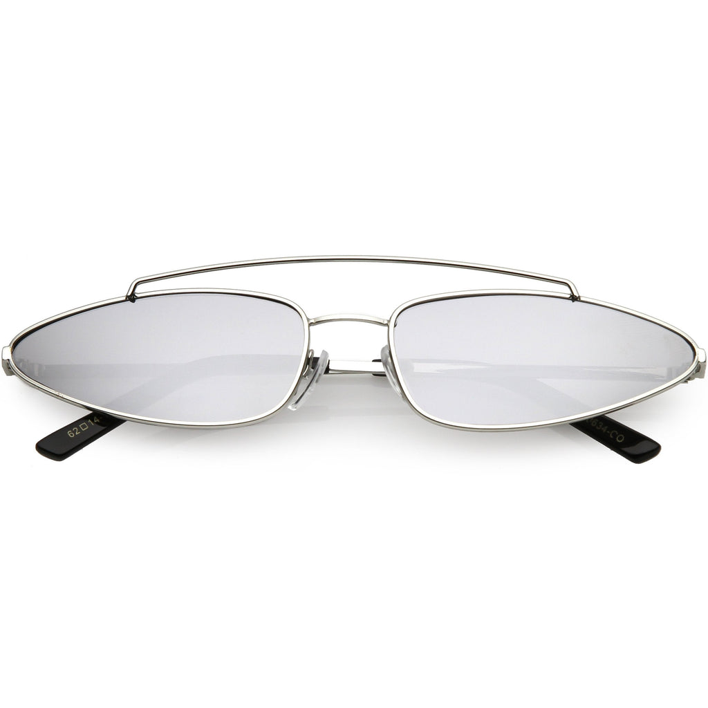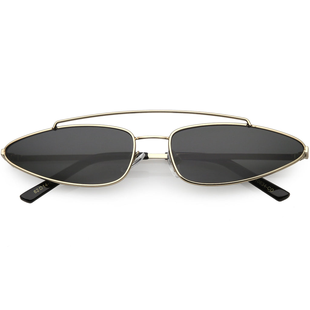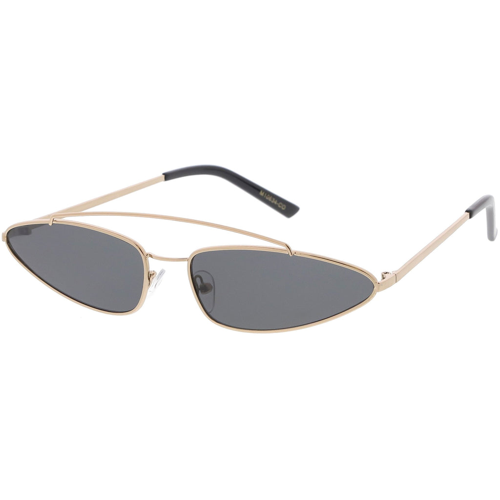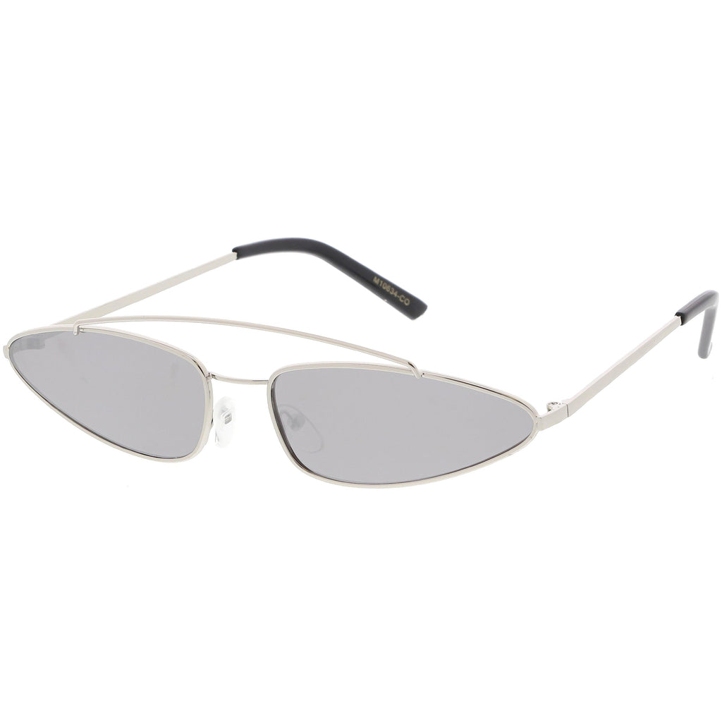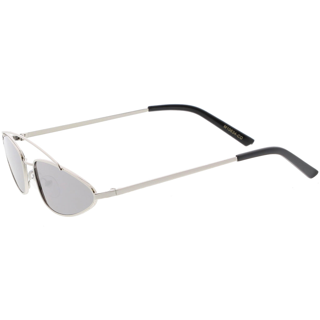 • 1990's trendy metal cat eye sunglasses designed with a slender metal frame and double bridge. Complemented with metal slim arms for a sleek look, these cat eye sunglasses come in a variety of color tinted lenses, smoke lens, and a mirrored lens for a bold effect. Made with a metal based frame, adjustable English style nose pieces, metal hinges, and 100% UV protected lenses.