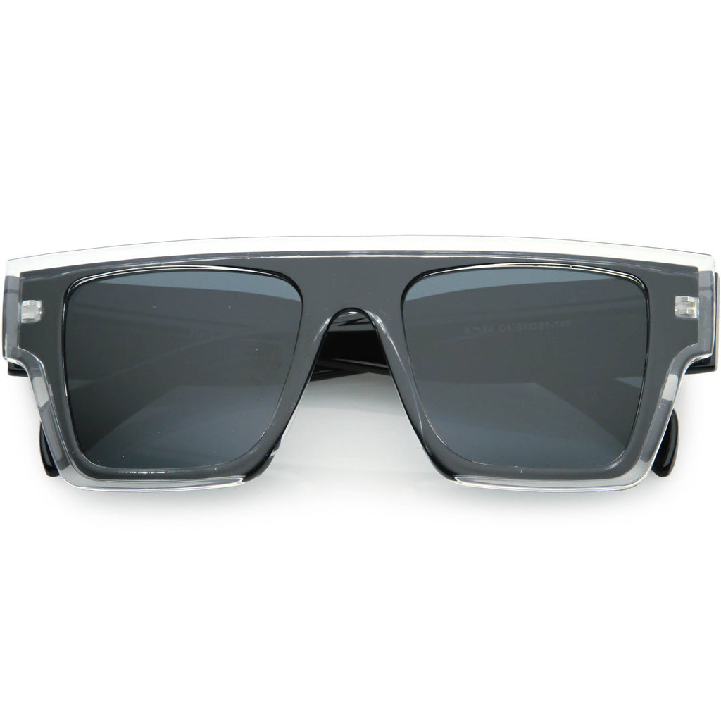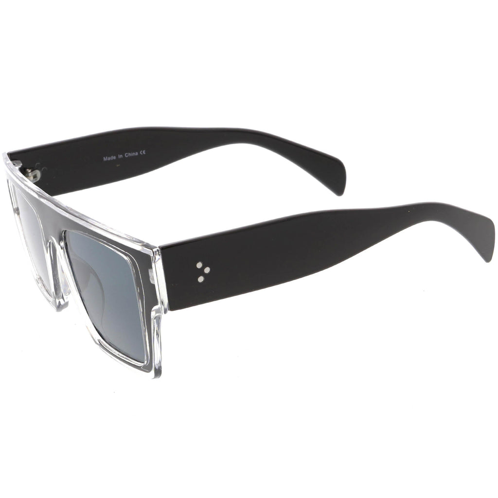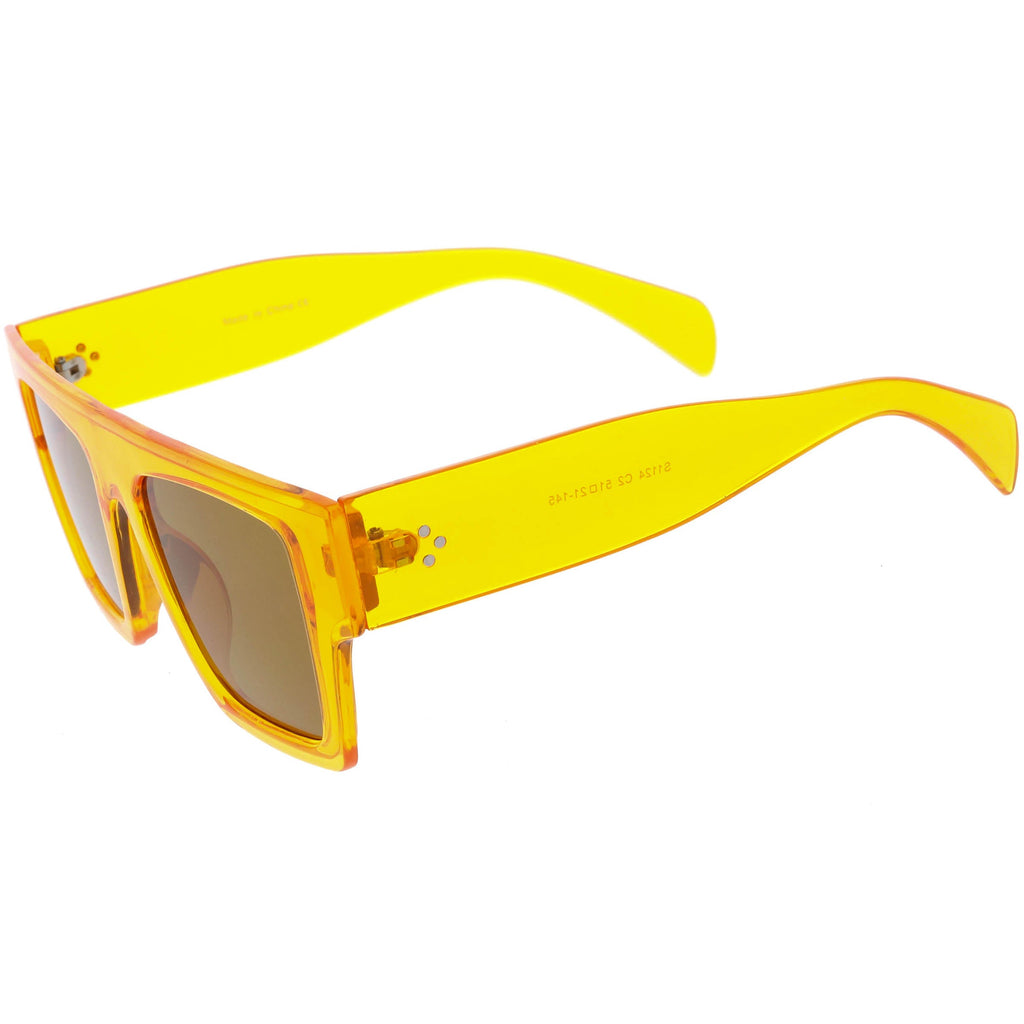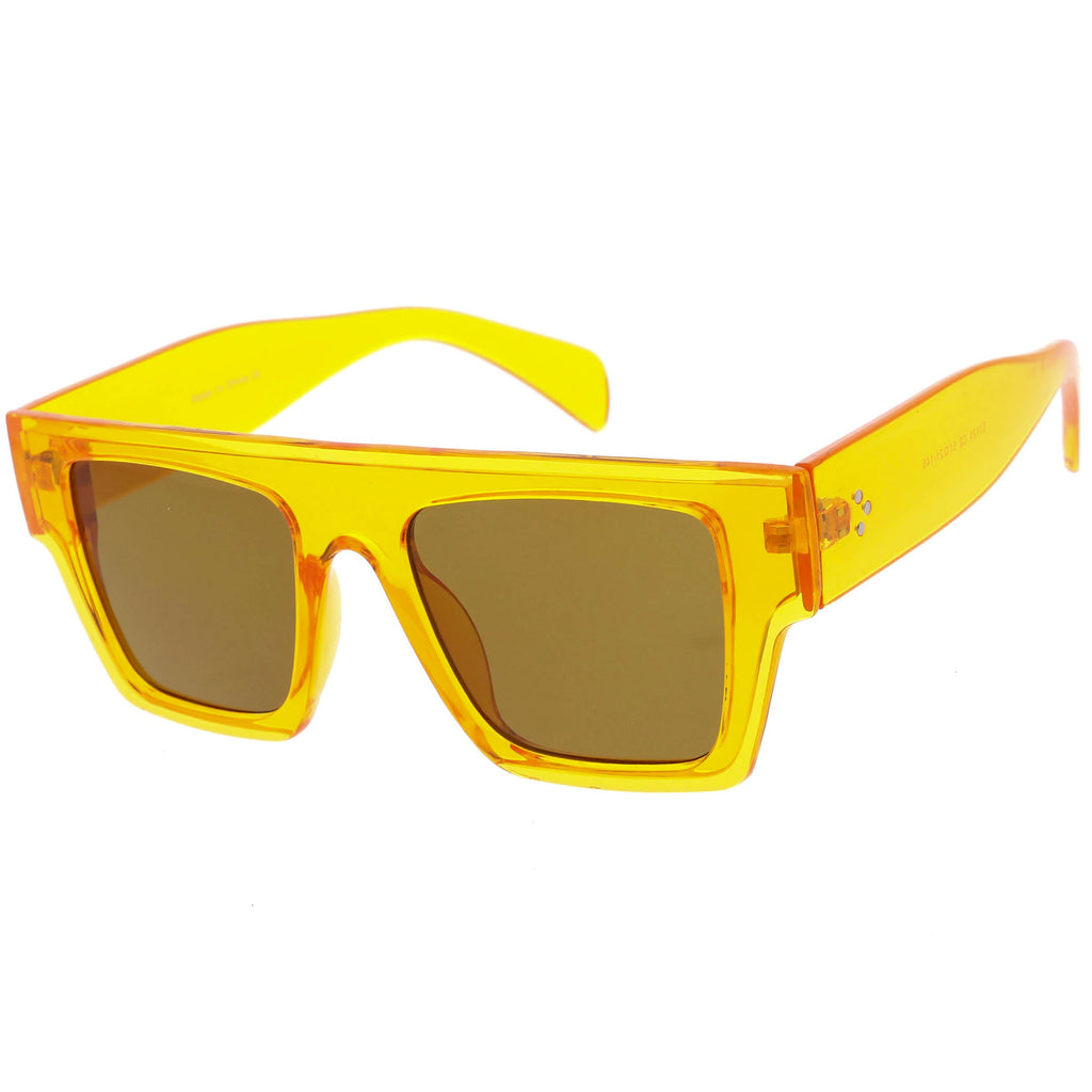 - Add a pop of color to your outfit with these shiny colorful transparent flat top sunglasses. The translucent sunglasses smoke lens finish with stylish high sitting temples complete this totally cool style. Perfect for beach days or your next vacation, these classic rimmed sunglasses are a must-have accessory. Made with a plastic based frame, reinforced metal hinges, and polycarbonate UV400 lenses.
