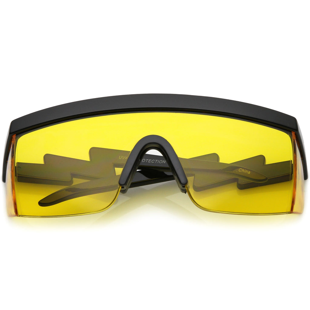 - Strap on those Rollerblades and hit the street with these rad goggle shield sunglasses exquisitely designed with a semi-rimless frame, flat top, and unique zigzag arms for a lightning effect. Accented with fun color tinted lenses for an eye-catching look and non-slip silicone nose pads for a secure fit. Made with a plastic based frame, pinhole hinges, and 100% UV protected lenses.